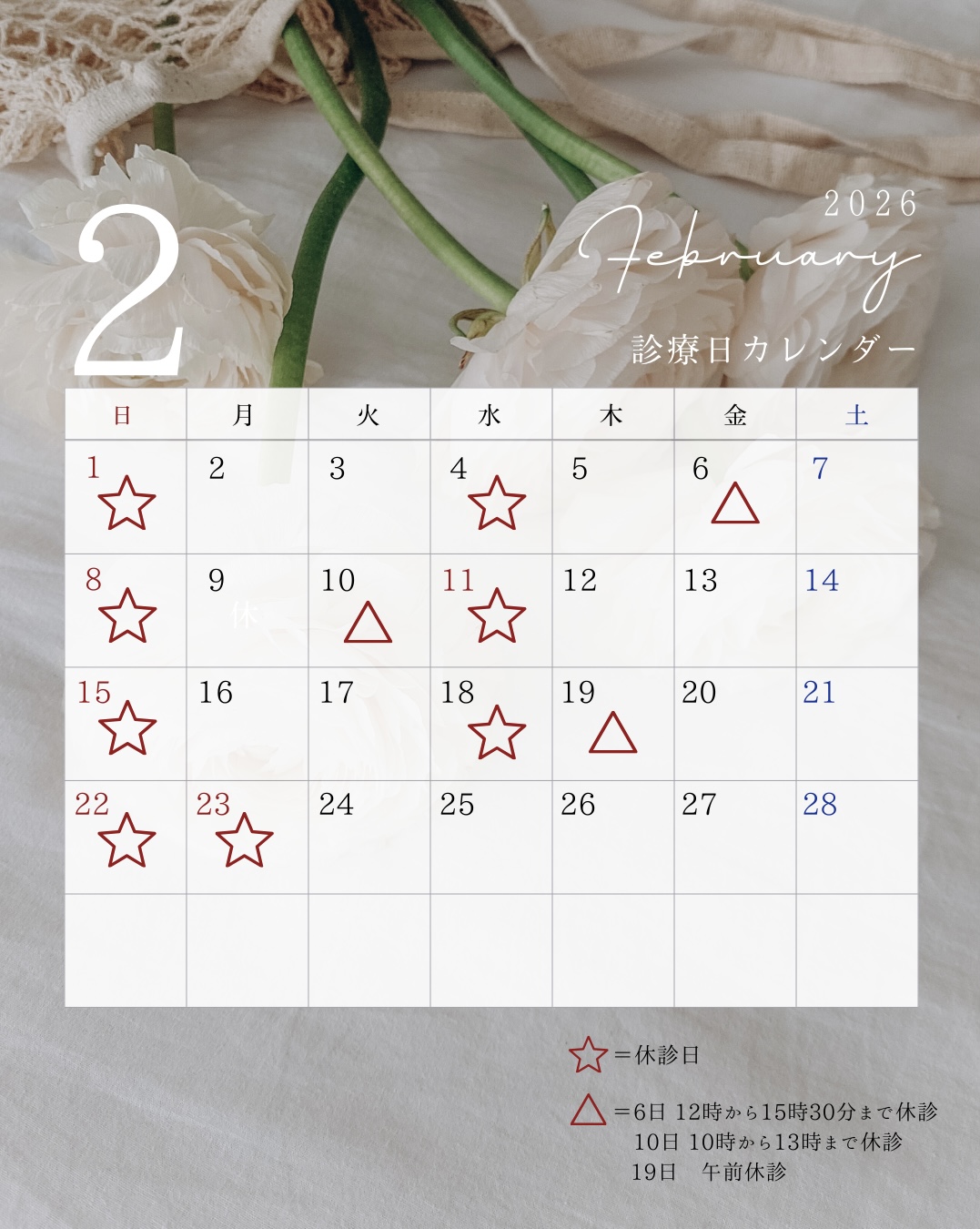 2月診療カレンダー 2026年1月15日 2月の休診日は下記の日程となります。 2/1(日) 2/4(水) 2/8(日) 2/11(水) 2/15(日) 2/18(水) 2/22(日) 2/23(月) 2/10(火)は全体会議のため、10時から14時まで診療を休診させていただきます。 2/13(金)は勉強会のため、12時から15時30分まで診療を休診させていただきます。 その他の時間は通常通り診療を行っております。 ご迷惑をおかけしますがよろしくお願いします。