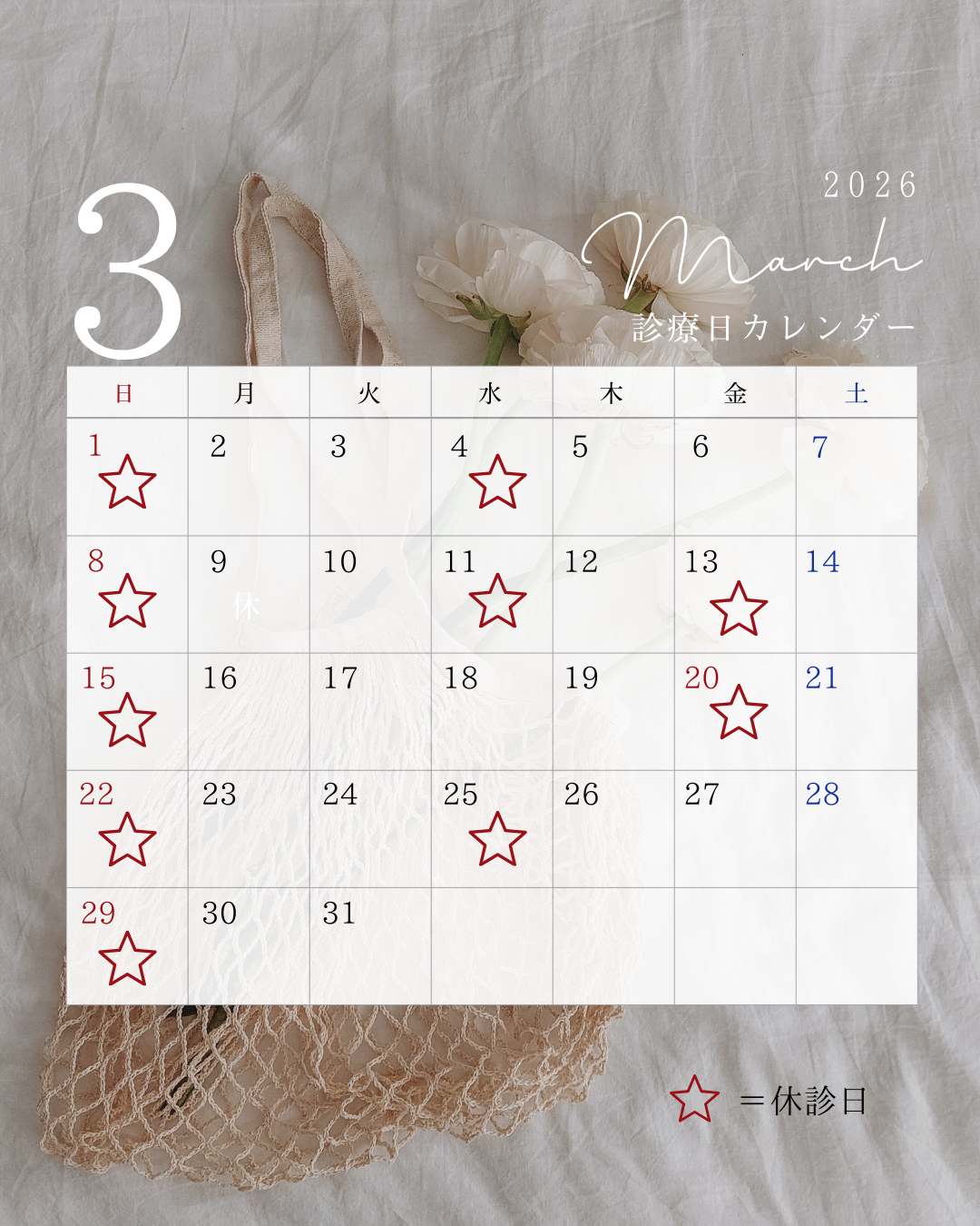 3月診療カレンダー 2026年2月15日 3月の休診日は下記の日程となります。 3/1(日) 3/4(水) 3/8(日)3/11(水)3/13(金)(会議のため終日休診) 3/15(日) 3/20(金) 3/22(日) 3/25(水) 3/29(日) 上記日程は休診となります。 大変ご迷惑をおかけしますがよろしくお願いします。